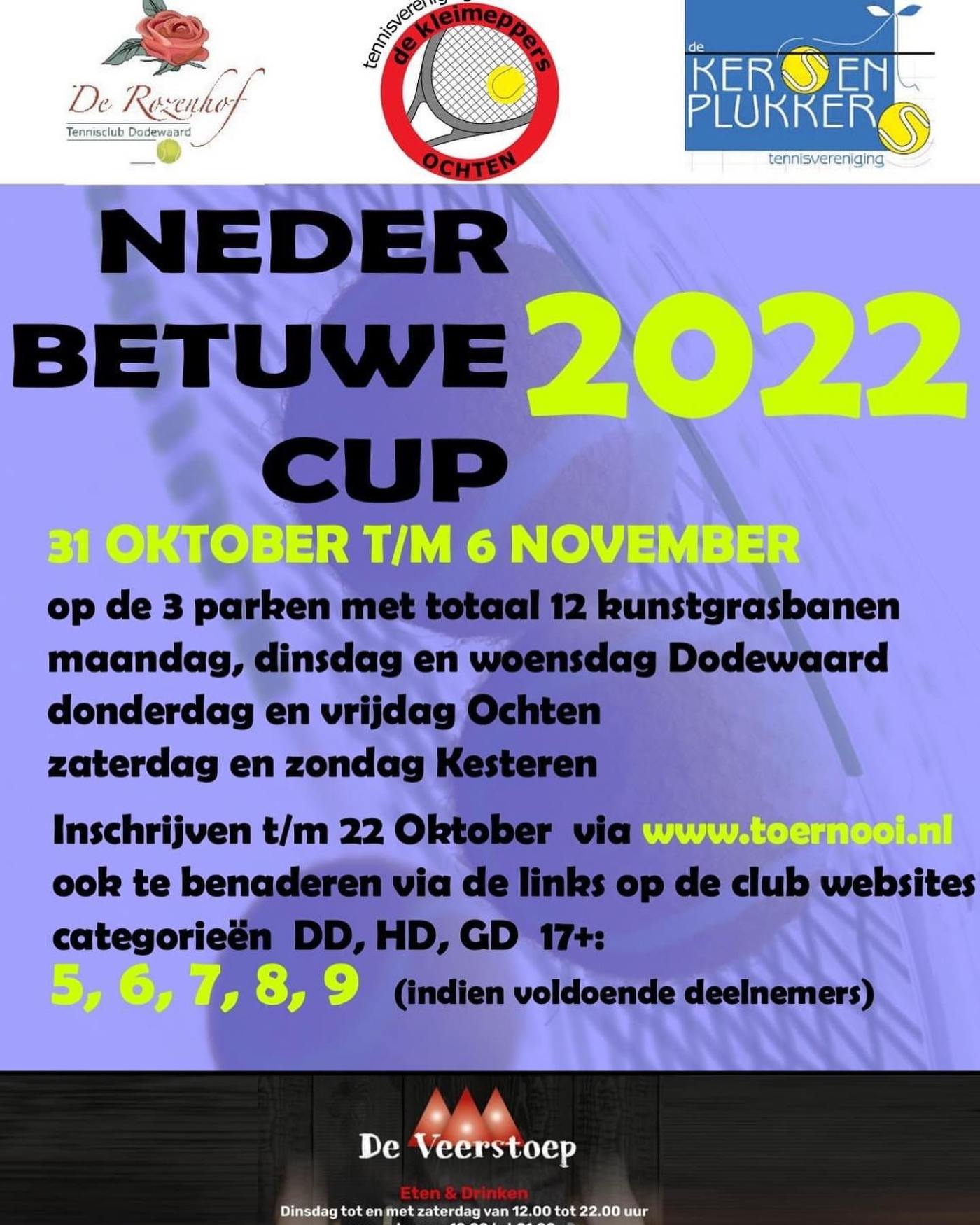 Maandag 31 oktober a.s. start weer ons super sportieve en gezellige dorpen Neder- Betuwe Cup toernooi. Tot en met zondag 6 november wordt er op de tennisbanen van Ochten, Dodewaard en Kesteren gespeeld in de heren, dames en gemengd dubbel in de speelsterktes 5 t/m 9. Dus voor iedere categorie wat wils. De uitslagen tellen niet mee voor je ranking. De slotdag wordt dit jaar in Kesteren gehouden.