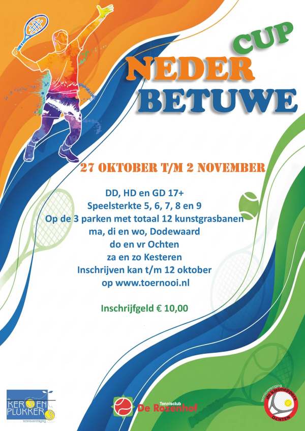 Van 27 oktober t/m zondag 2 november 2025 vindt voor de 16e keer het sportieve én gezellige Neder-Betuwe Cup tennistoernooi plaats. Op de tennisbanen van Ochten, Dodewaard en Kesteren wordt gestreden in de categorieën heren-, dames- en gemengd dubbel, in speelsterktes 5 t/m 9. Er is dus voor ieder wat wils! De feestelijke slotdag wordt dit jaar georganiseerd bij TV De Kersenplukkers in Kesteren.